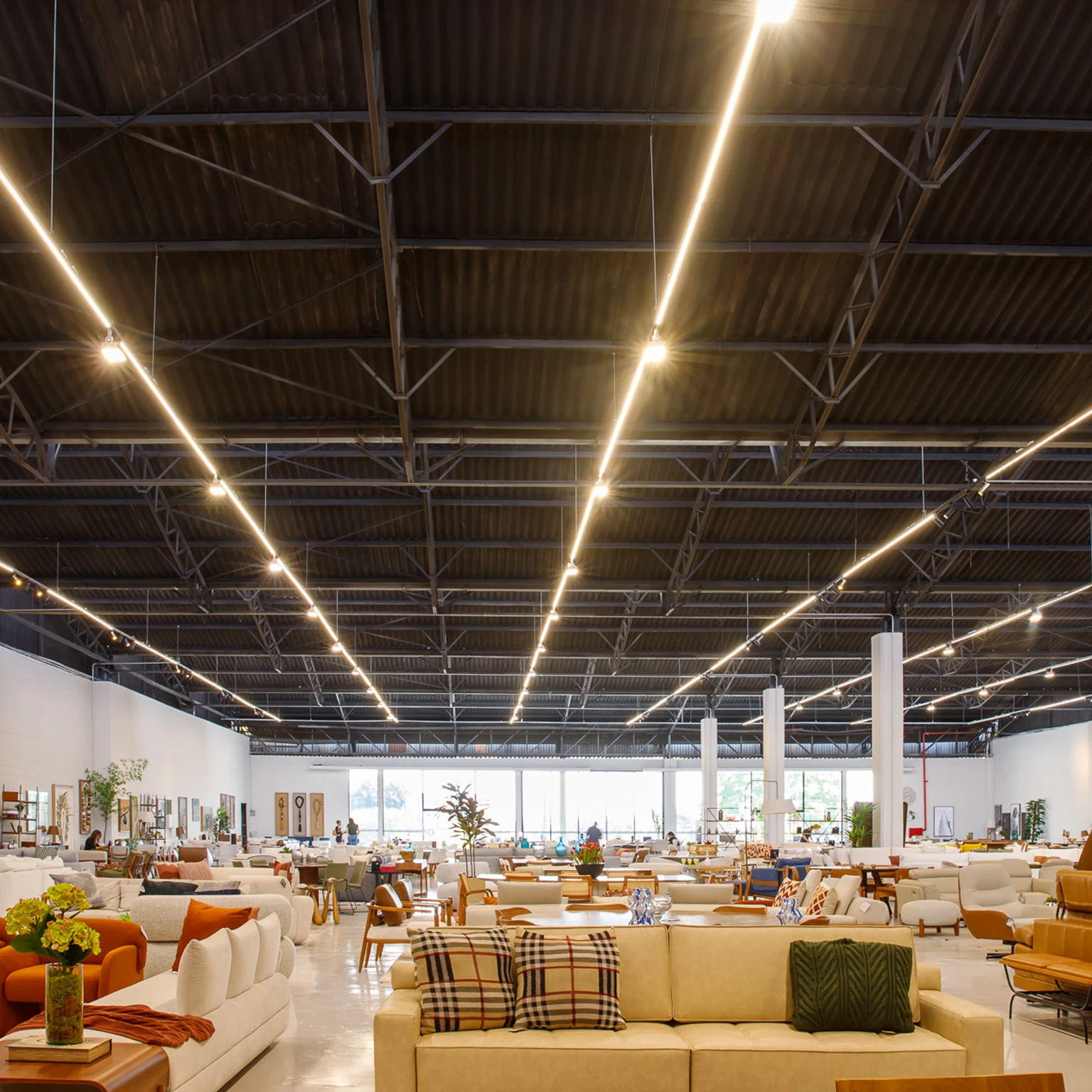 Iluminação direcionada para destacar móveis em exibição, mostrando detalhes e acabamentos de forma detalhada