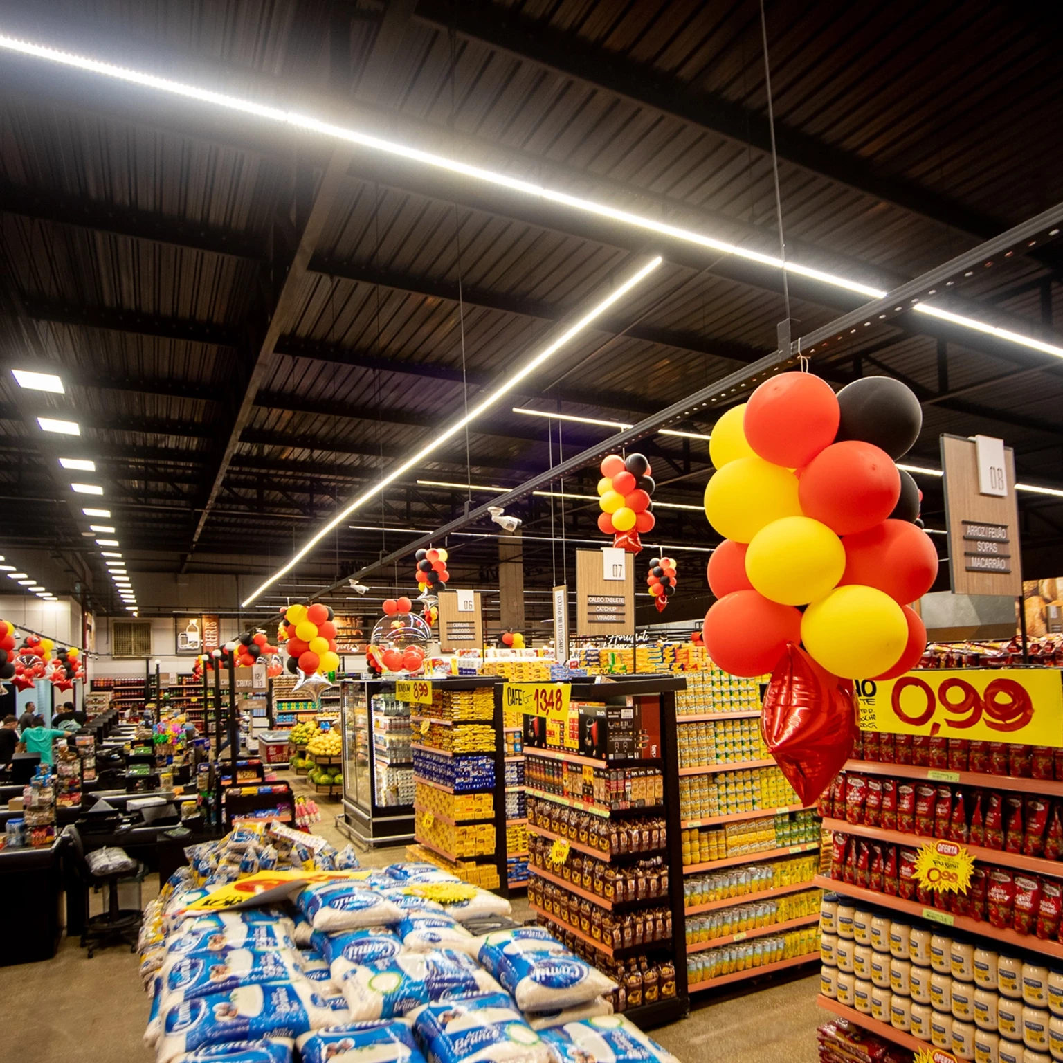 Iluminação direta que destaca produtos como frutas, carnes e padaria, tornando-os mais vívidos e impulsionando a compra.